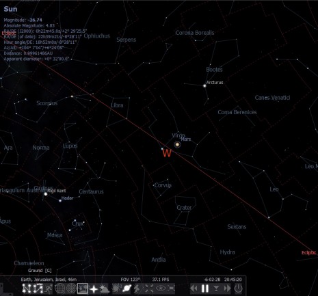 - The reader may duplicate these charts by downloading Stellarium, entering Jerusalem as the location (31°47′N, 35°10′E), and entering a time that equates with (year:-6, month:3, day:1, time: 6:45am Jerusalem time). The exact time that the program shows will depend on your timezone.